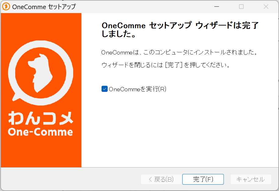 インストールが完了したら「完了」をクリックしてわんコメが起動します