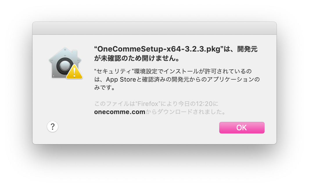 ダウンロードしたアプリケーションの実行許可が「AppStore」や「AppStoreと確認済みの開発元からのアプリケーションを許可」となっている場合、ダウンロードしたpkgファイルダブルクリックするのみでは以下のような警告が出てインストールできません