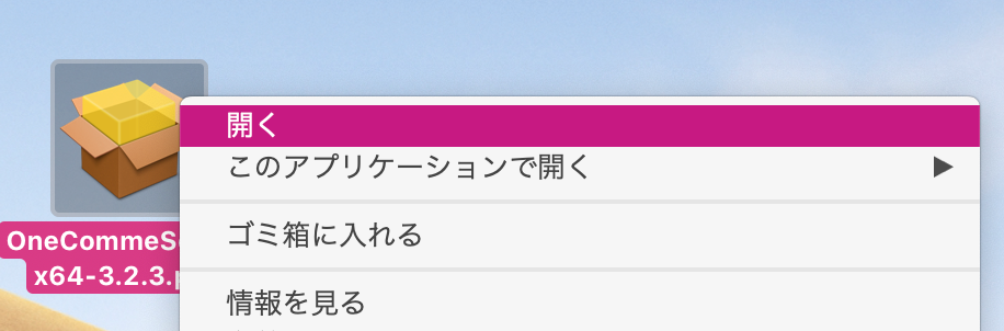 副クリックし、「開く」をクリックすることでインストールに進むことができます