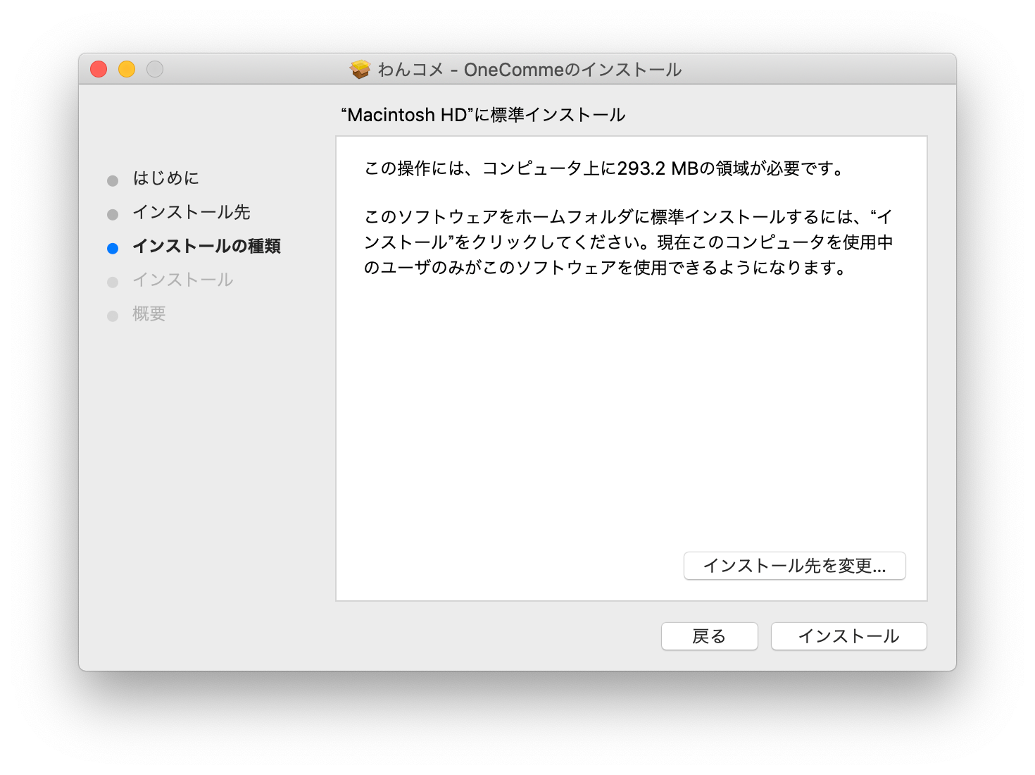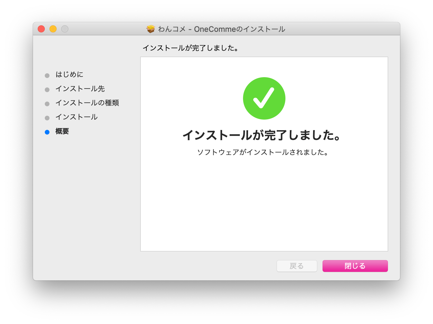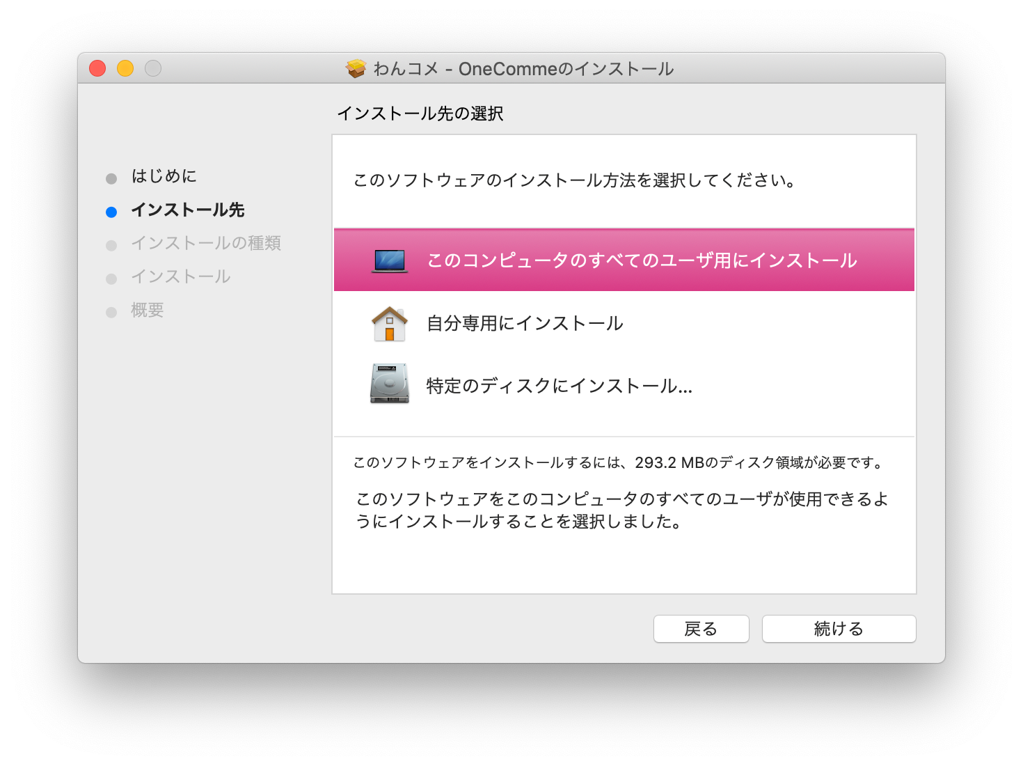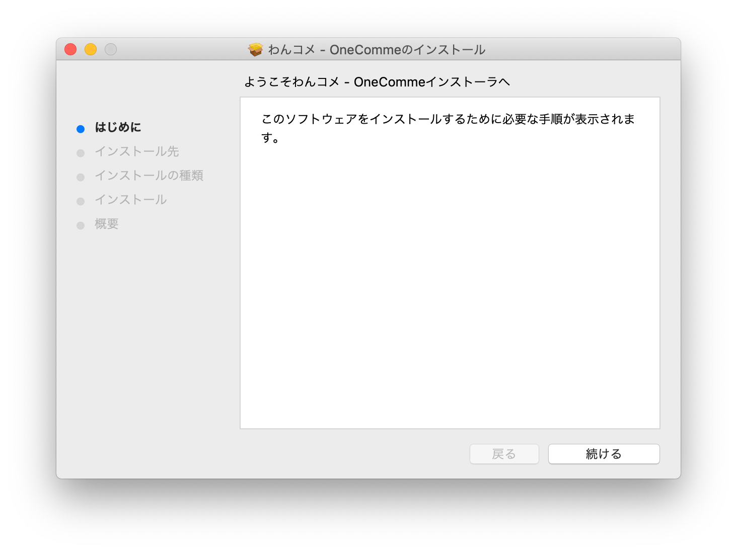 ダウンロードしたpkgファイルを開くとインストーラーが起動し、わんコメがインストールできます。