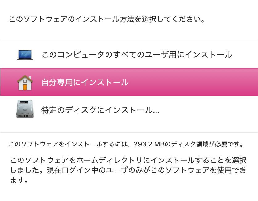 実行しているユーザ専用や、他のディスクにインストールすることも可能です。例えば、配信用のユーザにのみインストールしたい時などは「自分専用にインストール」を選択してください