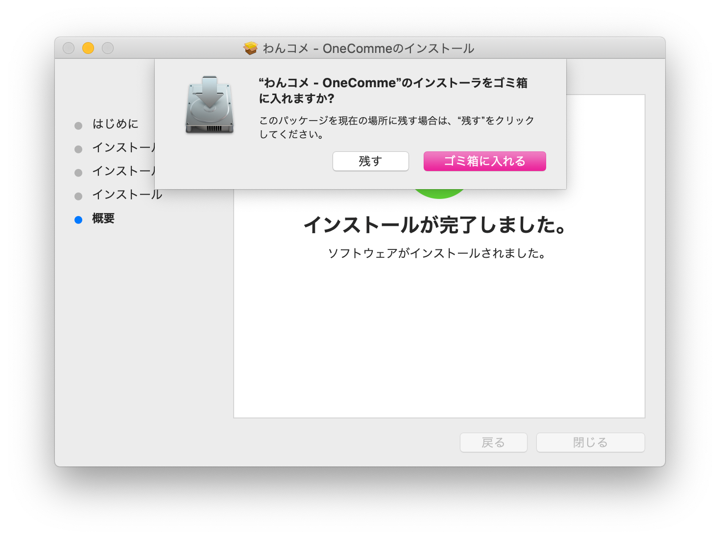 「閉じる」をクリックするとインストーラをゴミ箱に入れるか聞かれます