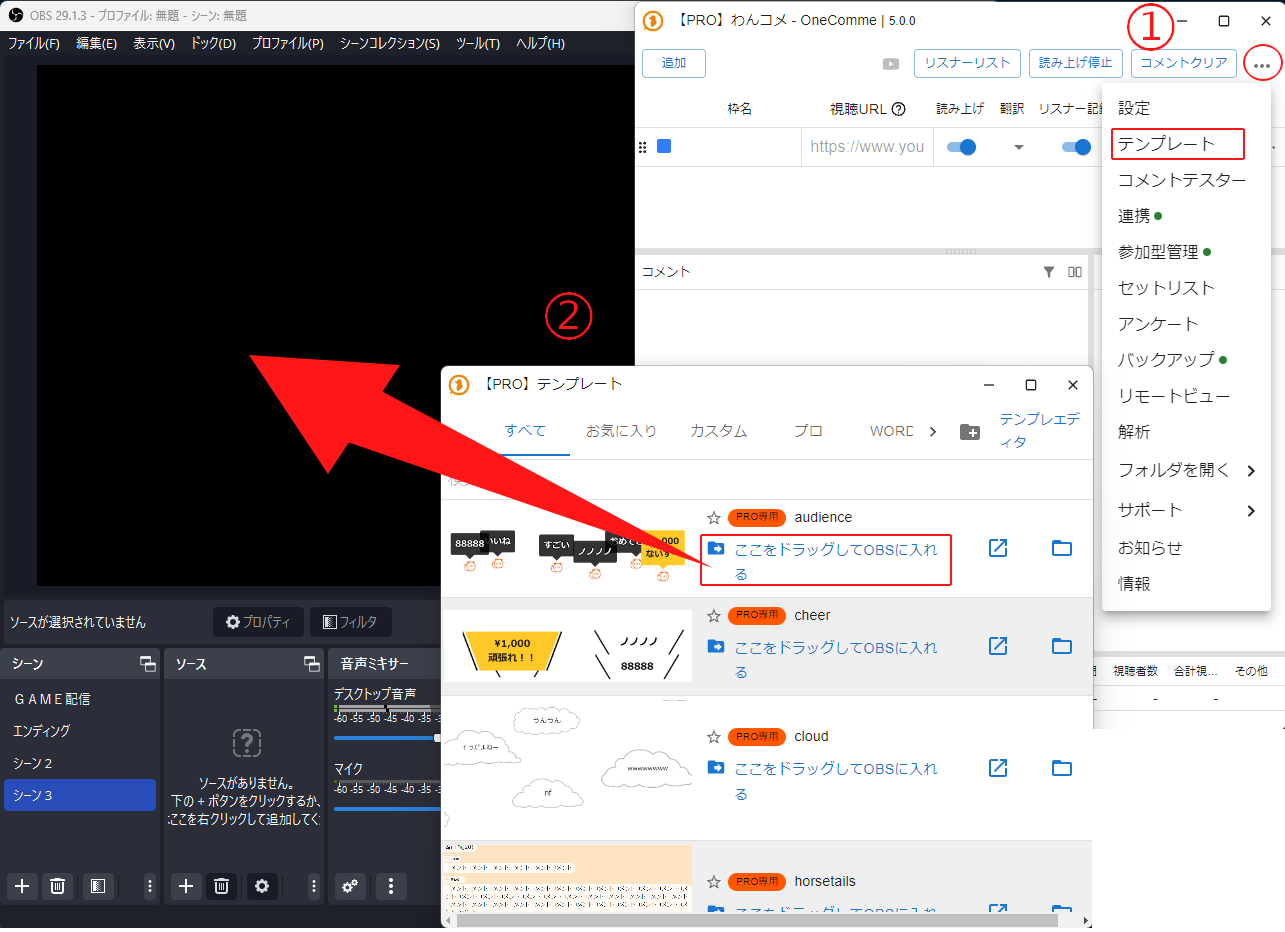 ②使いたいテンプレートの「ここをドラッグしてOBSに入れる」の部分をドラッグ&ドロップでOBSに追加します