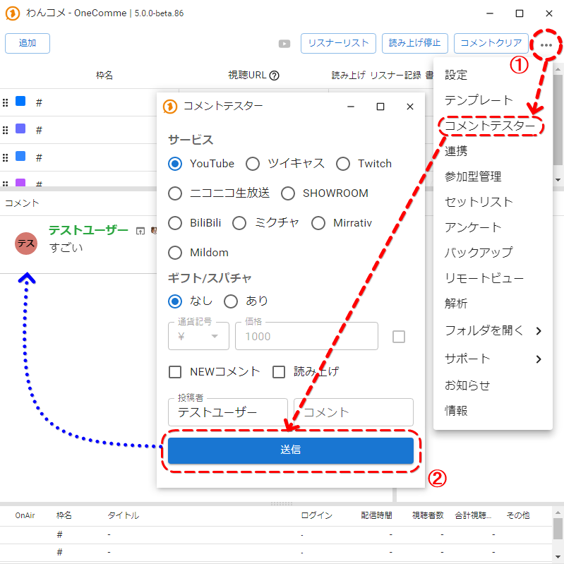 わんコメには、実際の配信でなくてもコメントのテストができる機能があります