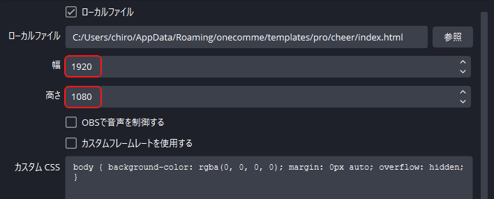 ブラウザソースのサイズはOBSに追加されたindex.html(ブラウザソース)の設定にある幅と高さを変更することで高さや幅の制御が可能です